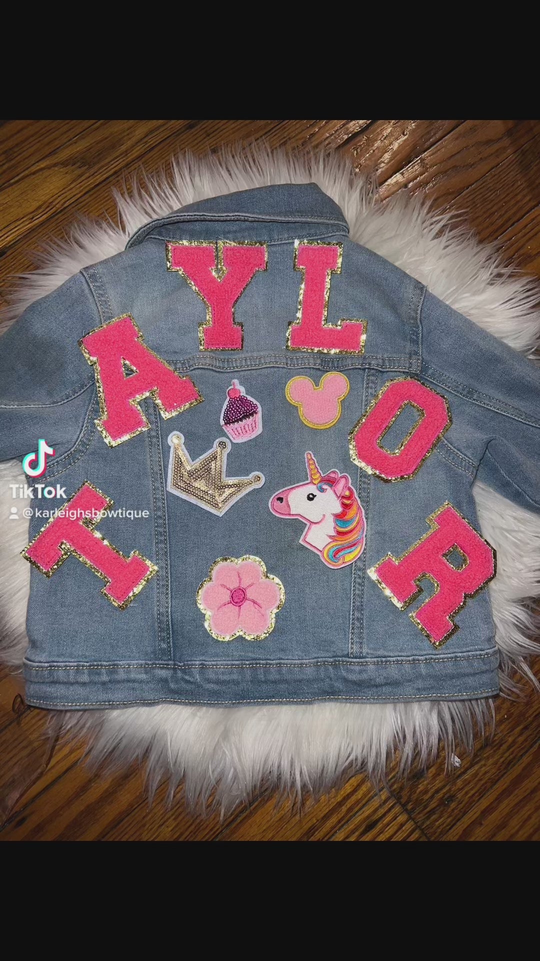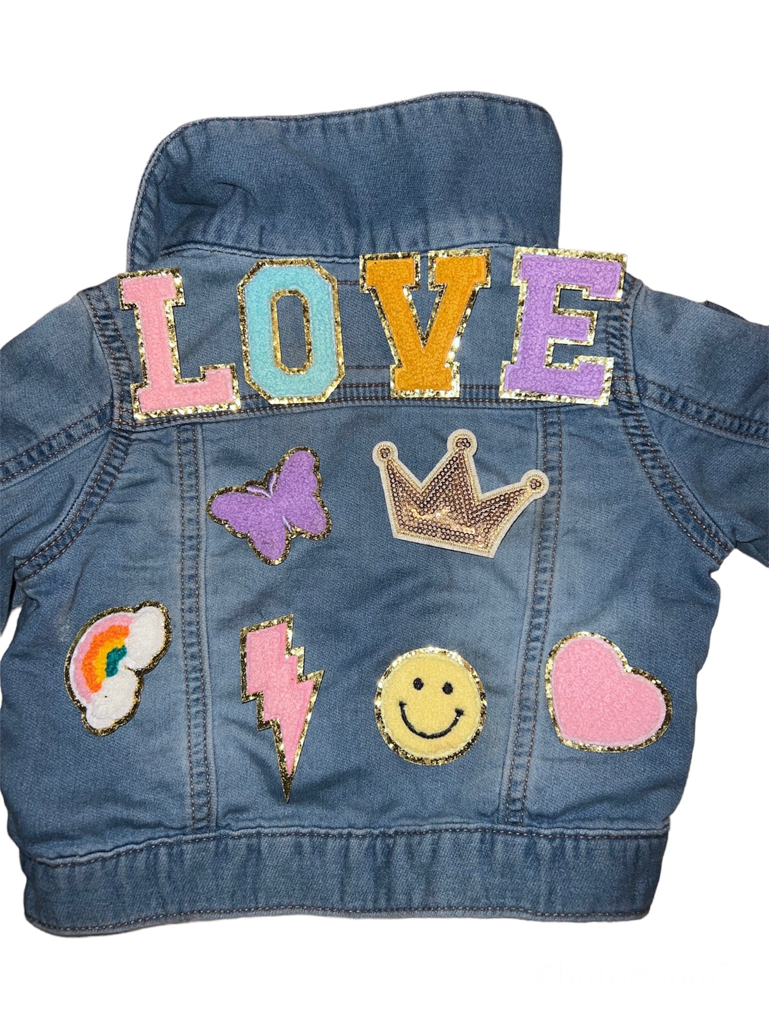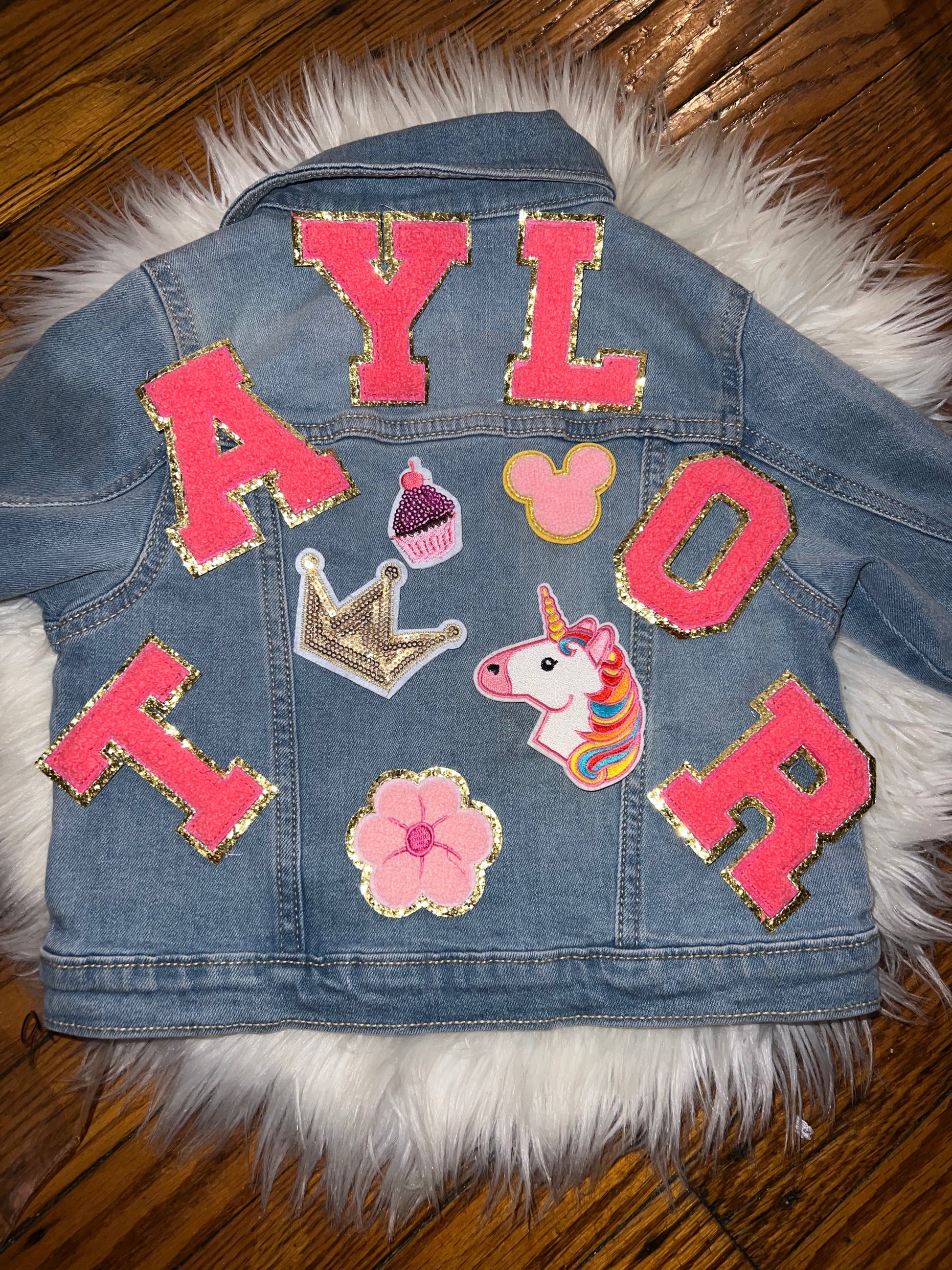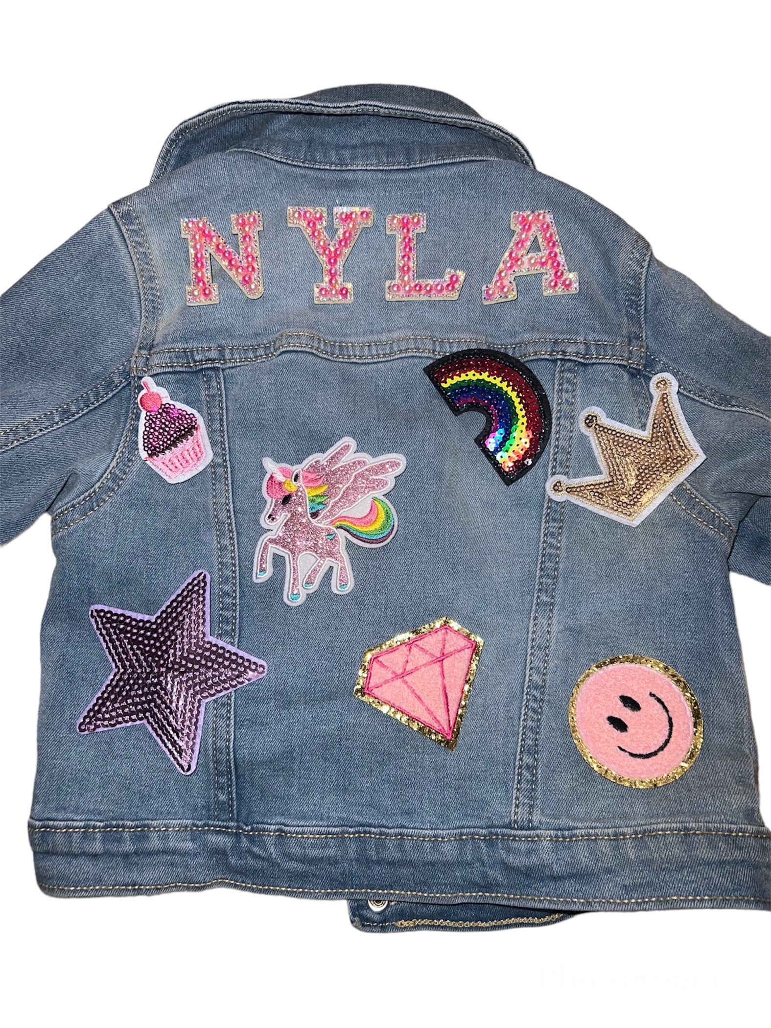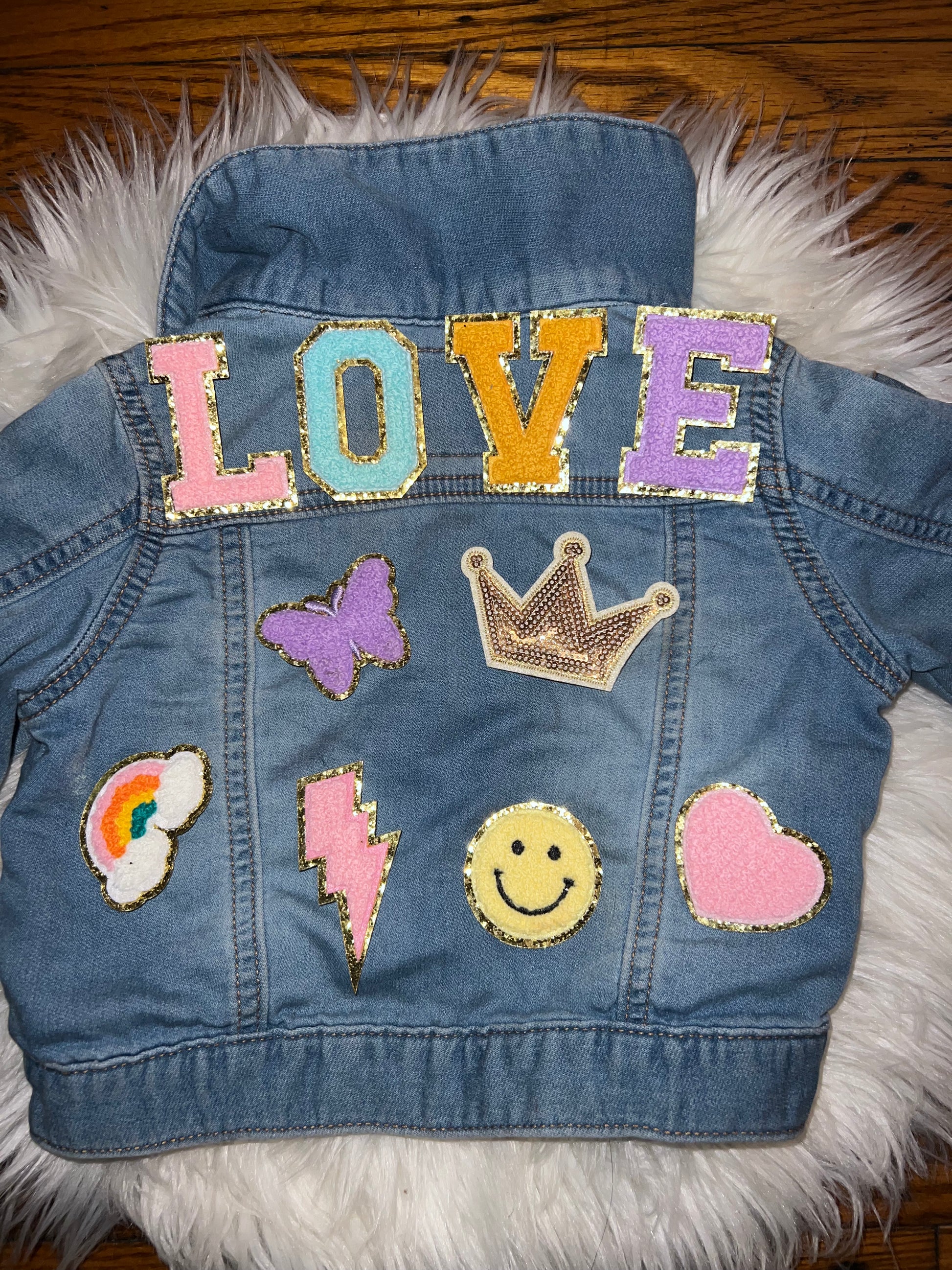 Create your own patchwork Jean jacket with patches of choice and the childs name on the back.