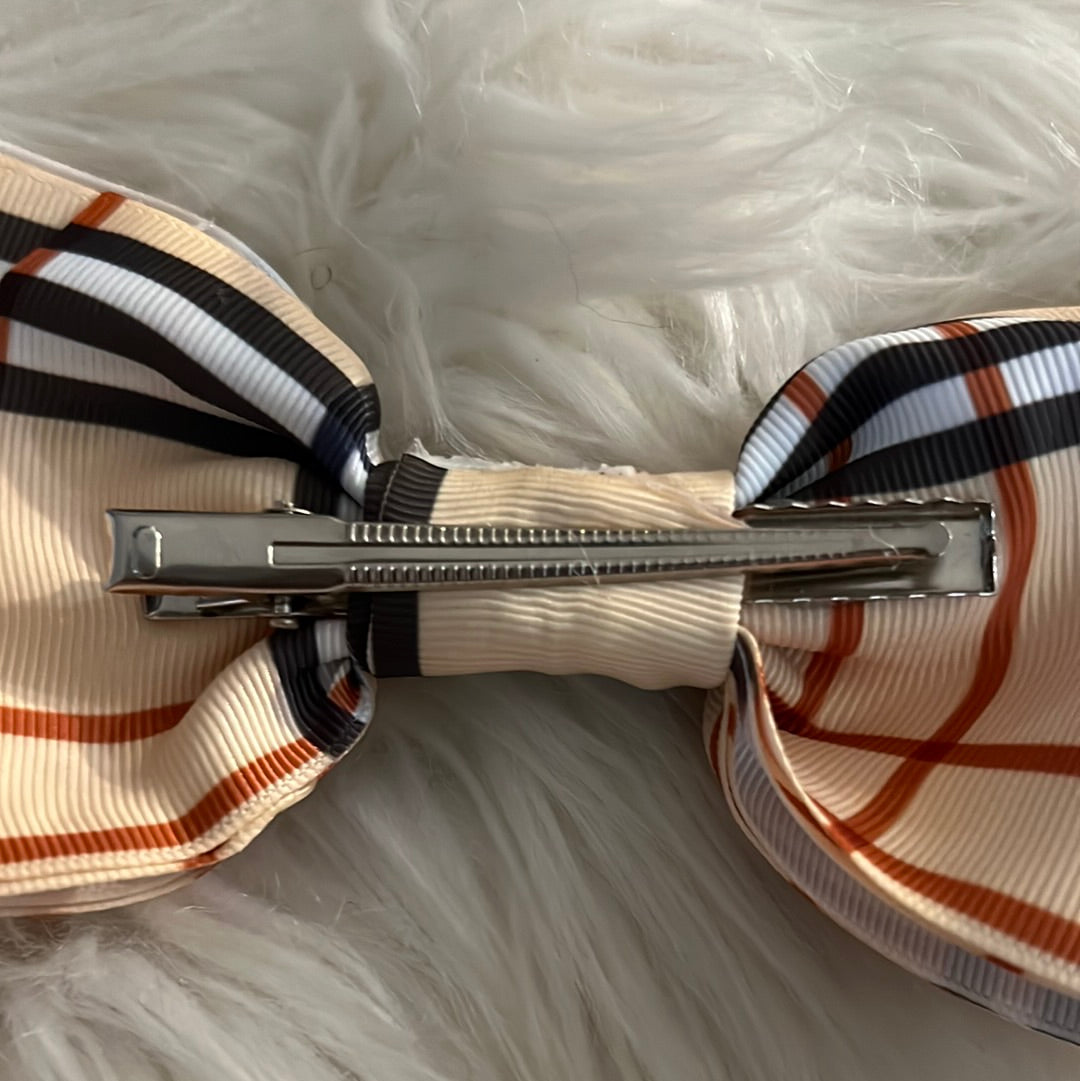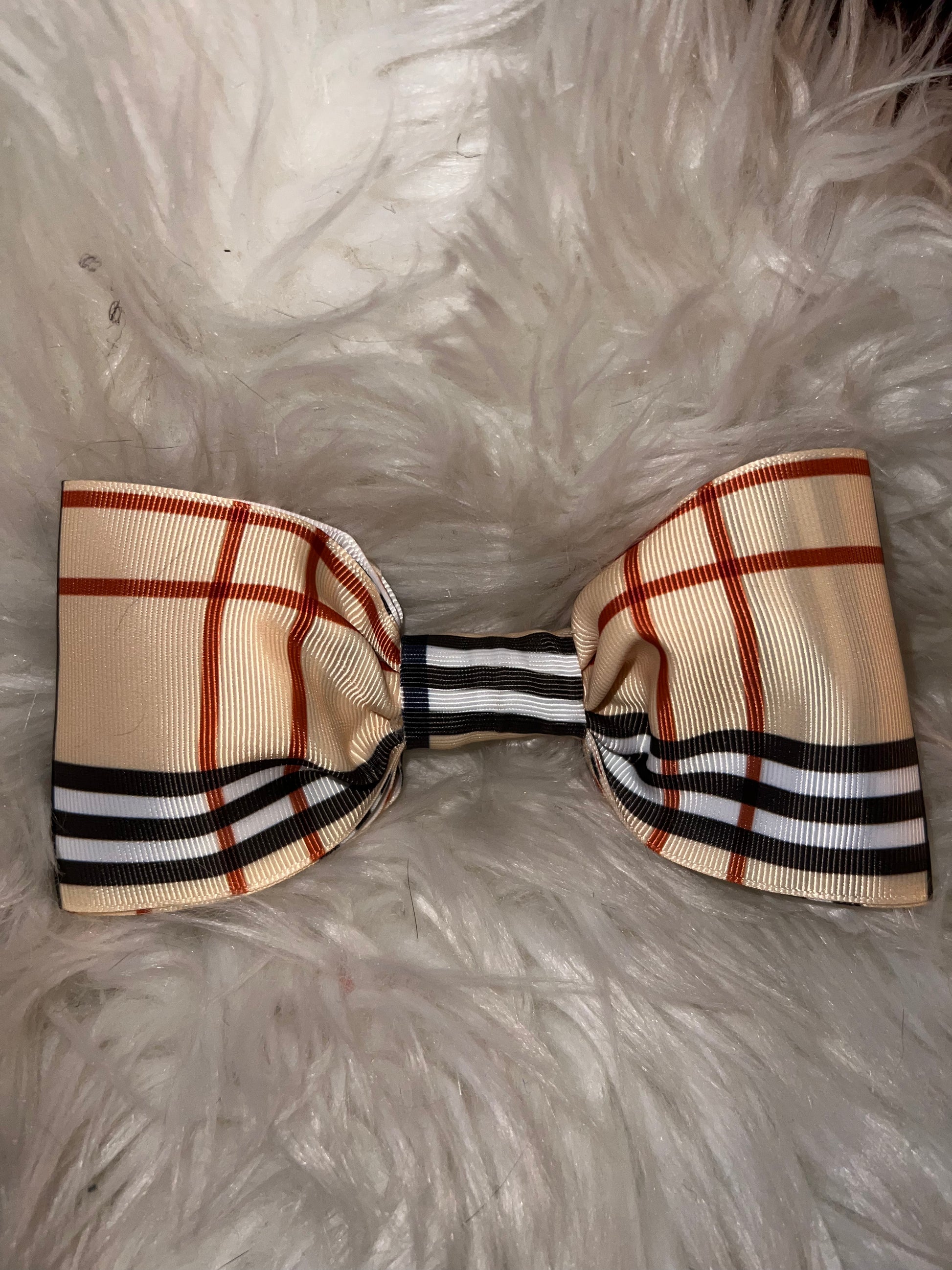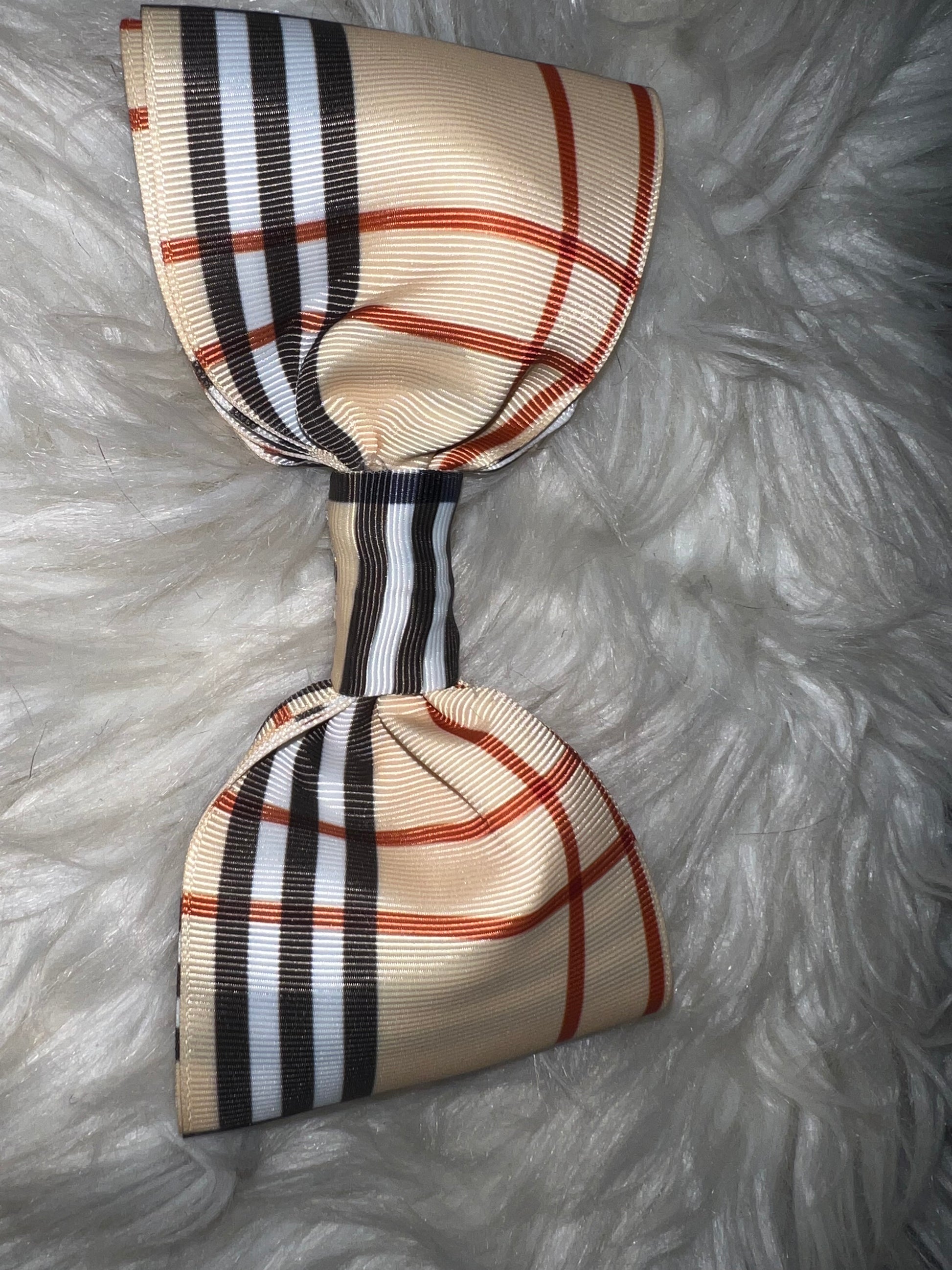This bow is made with grosgrain ribbon same as the Burberry socks that we offer. With an alligator clip on the back